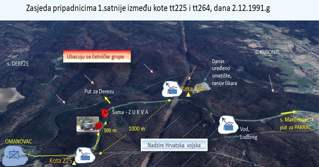 Samo dan nakon nesretne pogibije zapovjednika 1. satnije, Damira Hrašćanca, oca dviju kćeri, koji je bio teško ranjen 27.11.1991. godine, a preminuo u bolnici u Zagrebu 1. prosinca 1991., dana 2. prosinca 1991. godine dogodila se četnička zasjeda u kojoj pogibaju dvojica, a šestorica branitelja bivaju ranjena.