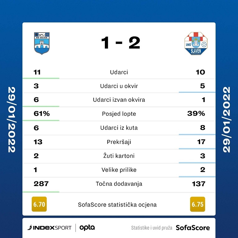 To je trebao biti znak za potpunu ofenzivu Osijeka, ali domaćini do kraja nisu odigrali apsolutno ništa. Njihovi pokušaji svodili su se na duge lopte koje je Slavenova obrana lakoćom čistila, a u drugoj minuti sudačke nadoknade gol je skoro pao, ali na drugoj strani. Brković je bio u odličnoj prilici, ali je pucao pokraj gola.