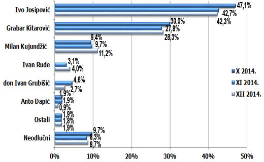 Ukupno gledajući izbor Milana Kujundžića je u prosincu porastao prema onom u listopadu (1,8 postotnih poena), ali i prema studenom (+1,5 postotnih poena). Ivo Josipović je u ovomjesečnom istraživanju u odnosu na mjerenje provedeno početkom listopada zabilježio negativnu tendenciju (s 4,8 postotnih poena), ali i u odnosu na studeni (-0,4 postotnih poena). HDZ-ova kandidatkinja Kolinda Grabar Kitarović je u ovomjesečnom mjerenju zabilježila bolji rezultat od onog iz studenog (+0,4 postotna poena), dok je u odnosu na mjerenje u listopadu ovomjesečni rezultat slabiji za 1,7 postotnih poena.