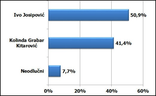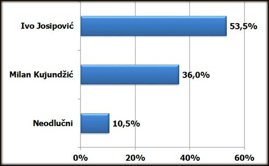 Ivo Josipović bi u ovom pripetavanju zabilježio izbor od 53,5 posto, dok bi za Milana Kujundžića glasalo 36 posto birača (uz 10,5 posto neodlučnih).