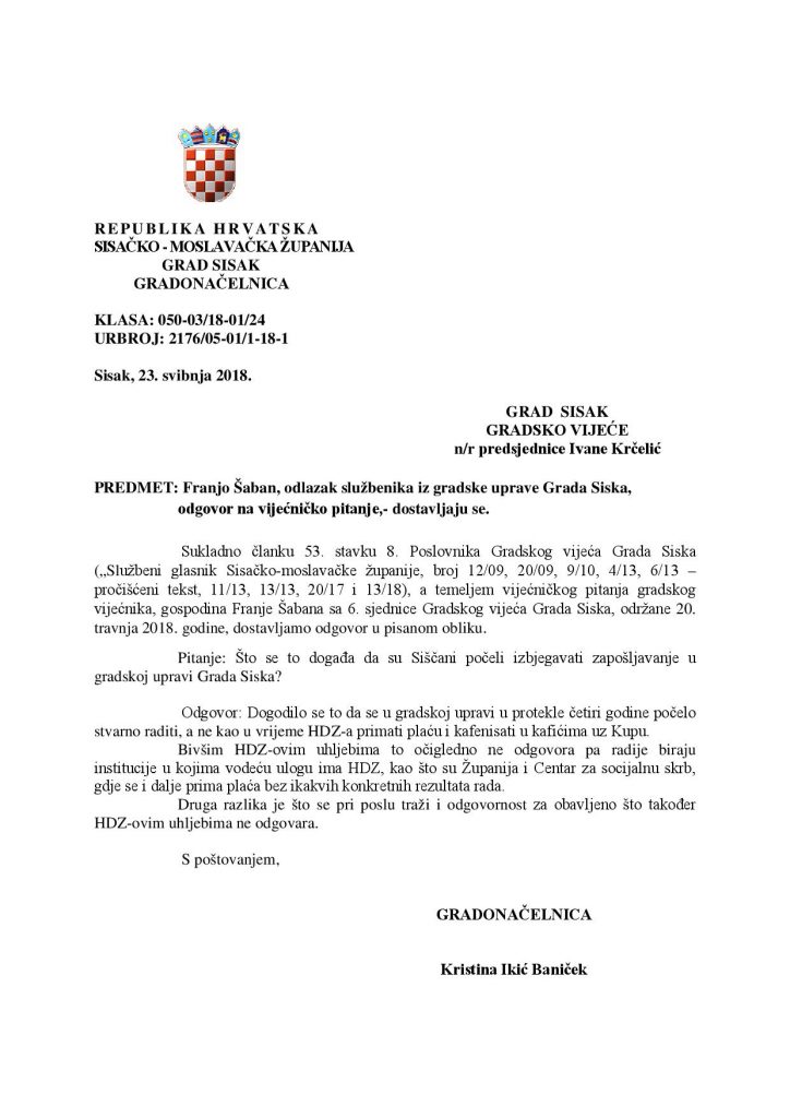 HDZ-ovom vijećniku Franji Šabanu, kojeg je pak zanimalo što se događa da su Siščani počeli izbjegavati zapošljavanje u gradskoj upravi Grada Siska, gradonačelnica je pismeno dogovorila: „Dogodilo se to da se u gradskoj upravi u protekle četiri godine počelo stvarno raditi, a ne kao u vrijeme HDZ-a primati plaću i kafenisati u kafićima uz Kupu. Bivšim HDZ-ovim uhljebima to očigledno ne odgovora pa radije biraju institucije u kojima vodeću ulogu ima HDZ, kao što su Županija i Centar za socijalnu skrb, gdje se i dalje prima plaća bez ikakvih konkretnih rezultata rada. Druga razlika je što se pri poslu traži i odgovornost za obavljeno što također HDZ-ovim uhljebima ne odgovara.“
