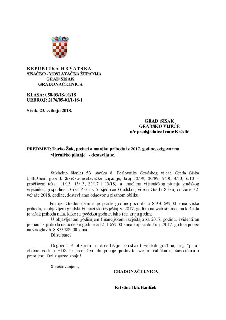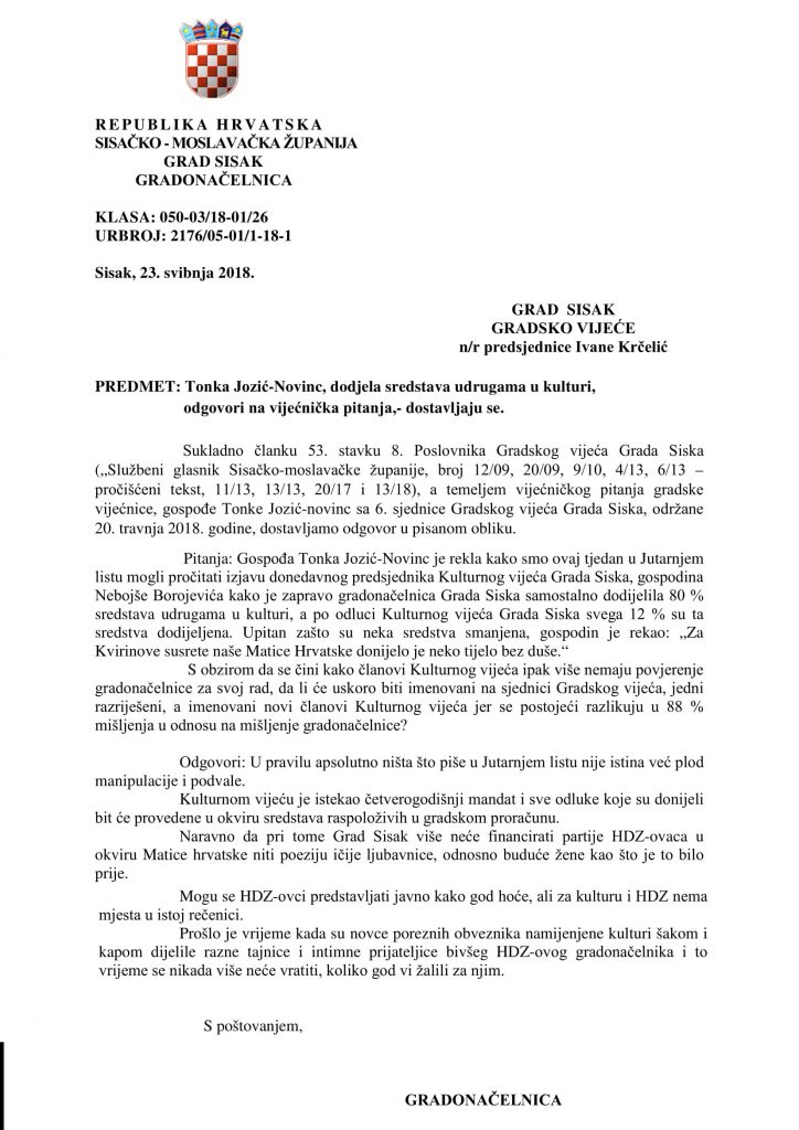 Naime, pitanje vezano uz dodjelu sredstava udrugama u kulturi na Aktualnom satu postavila je HDZ-ova vijećnica Tonka Jozić-Novinc kojoj je gradonačelnica Kristina Ikić Baniček pismeno odgovorila kako u pravilu apsolutno ništa što piše u Jutarnjem listu nije istina već plod manipulacije i podvale. „ Kulturnom vijeću je istekao četverogodišnji mandat i sve odluke koje su donijeli bit će provedene u okviru sredstava raspoloživih u gradskom proračunu. Naravno da pri tome Grad Sisak više neće financirati partije HDZ-ovaca u okviru Matice hrvatske niti poeziju ičije ljubavnice, odnosno buduće žene kao što je to bilo prije. Mogu se HDZ-ovci predstavljati javno kako god hoće, ali za kulturu i HDZ nema mjesta u istoj rečenici. Prošlo je vrijeme kada su novce poreznih obveznika namijenjene kulturi šakom i kapom dijelile razne tajnice i intimne prijateljice bivšeg HDZ-ovog gradonačelnika i to vrijeme se nikada više neće vratiti, koliko god vi žalili za njim“, stoji u odgovoru gradonačelnice.