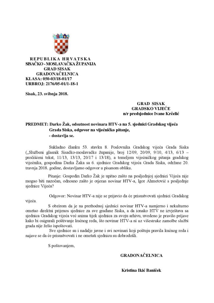 Skandalozni odgovori gradonačelnice na vijećnička pitanja postavljena na Aktualnom satu 6. sjednice Gradskog vijeća Grada Siska bili su tema konferencije za novinare koju su 6. lipnja održali gradski vijećnici Kluba zastupnika HDZ-a, HSLS-a,HSP AS-a i HKS-a predvođeni predsjednikom sisačkog HDZ-a Ivanom Celjakom.