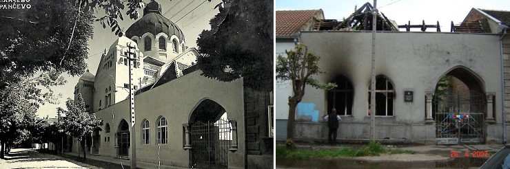 Velebno zdanje sinagoge u Pančevu (izgrađena 1902., srušena 1954. godine - prema nekim podacima 1956. godine), ostaci građevine izgorjeli u podmetnutom požaru 2007. godine; slika desno