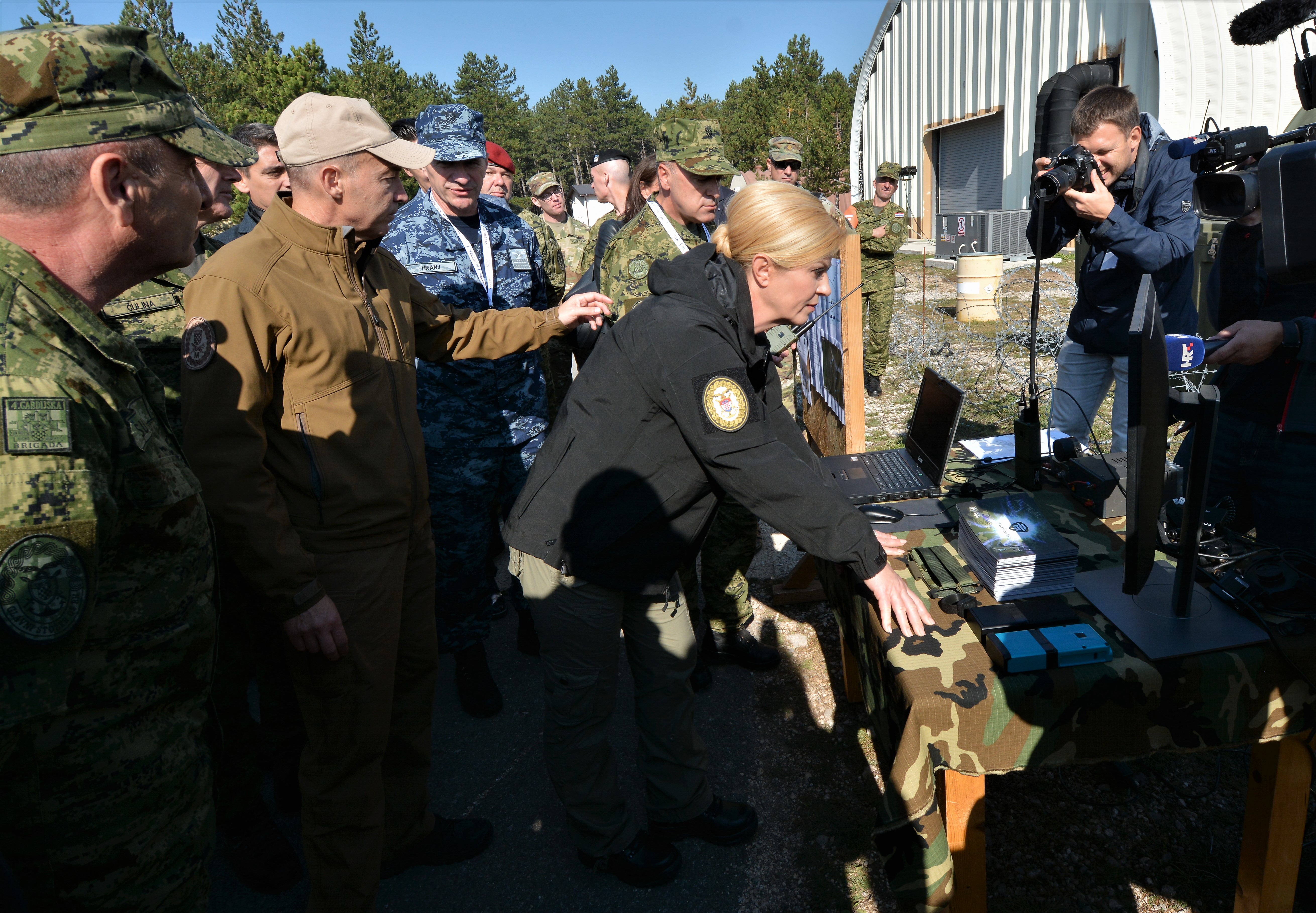 Zapovjednik vježbe, koji je i zapovjednik Zapovjedništva viceadmiral Rober Hranj brifirao je predsjednicu i ministra brane o situaciji na raznim poligonima, zapovjedništvima Sjever i Jug, te o napadnim i obrambenim akcijama na 11 poligona u realnom vremenu, uključujući i pregled poligona Udbina iz zraka, s bespilotne letjelice.