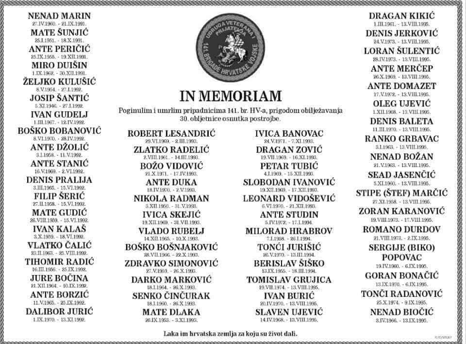 Danas, 34 godine kasnije, 141. brigada i dalje živi u uspomenama svojih pripadnika i u srcima svih koji slobodu shvaćaju kao zavjet plaćen krvlju hrvatskih branitelja.