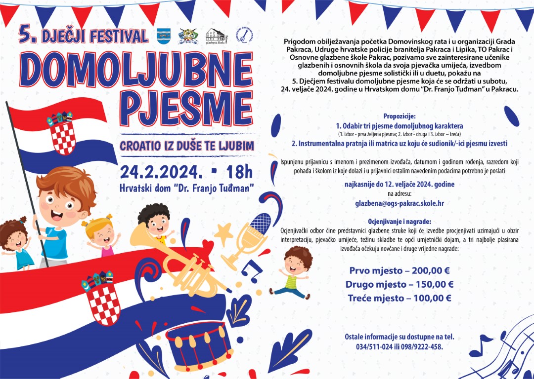 Uoči obilježavanja 33. godišnjice početka Domovinskog rata, 24. veljače u 18 sati će u Hrvatskom domu dr. Franjo Tuđman biti održan 5. Dječji festival domoljubne pjesme „Croatio iz duše te ljubim“. Festival organiziraju Grad Pakrac, Udruga hrvatske policije branitelja Pakraca i Lipika, Tamburaški orkestar Pakrac i Osnovna glazbena škola Pakrac, a cilj ovog festivala je potaknuti osnovne, ali i glazbene škole da veću važnost pridaju njegovanju hrvatske domoljubne pjesme.