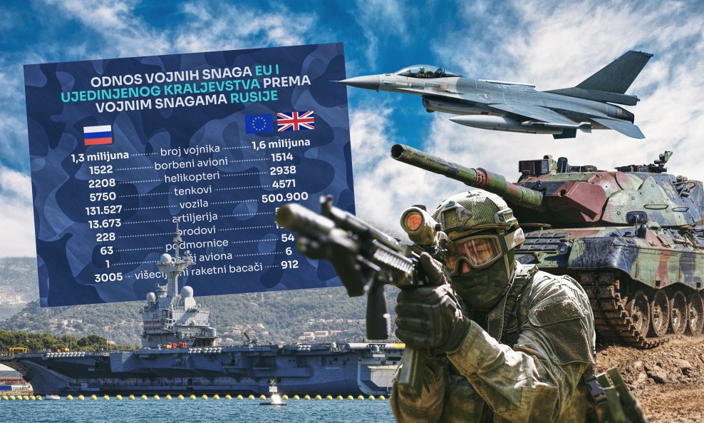 Prvi podatak koji se navodi broj je vojnika, kojih Rusija, zemlja sa 144 milijuna stanovnika, ima 1,3 milijuna, a EU i Ujedinjeno Kraljevstvo, koji zajedno broje 518 milijuna stanovnika, imaju 1,6 milijuna vojnika. U to su uračunati samo aktivni vojnici, bez pričuve, paravojski i vojno sposobnog stanovništva, od kojih bi dio sigurno bio mobiliziran u slučaju rata. Najveće vojske u europskom savezu imaju Poljska s 202.000 i Francuska s 200.000 vojnika, a slijede ih UK s nešto manje od 185.000 i Njemačka s njih nešto više od 181.000. Hrvatska može pridonijeti s nešto više od 14.000 vojnika.