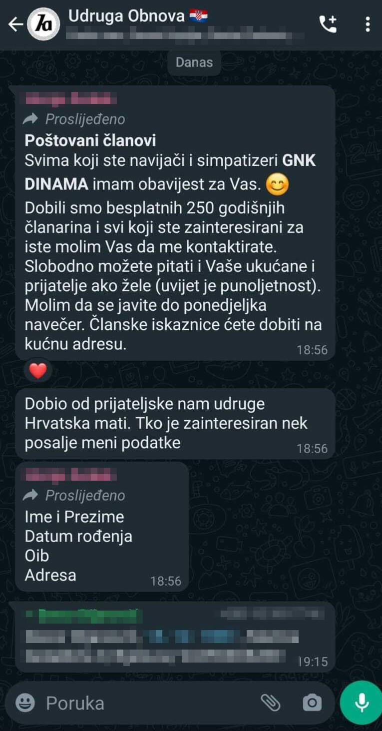 Jedna udruga (ispod je slika WhatsApp prepiske) dobila je obavijest o čak 250 "besplatnih" godišnjih članarina u zamjenu za podatke. Kako tvorac poruke i sam piše, to nije jedina udruga koja je dobila takvu ponudu, nego je ona prenesena iz druge grupe.