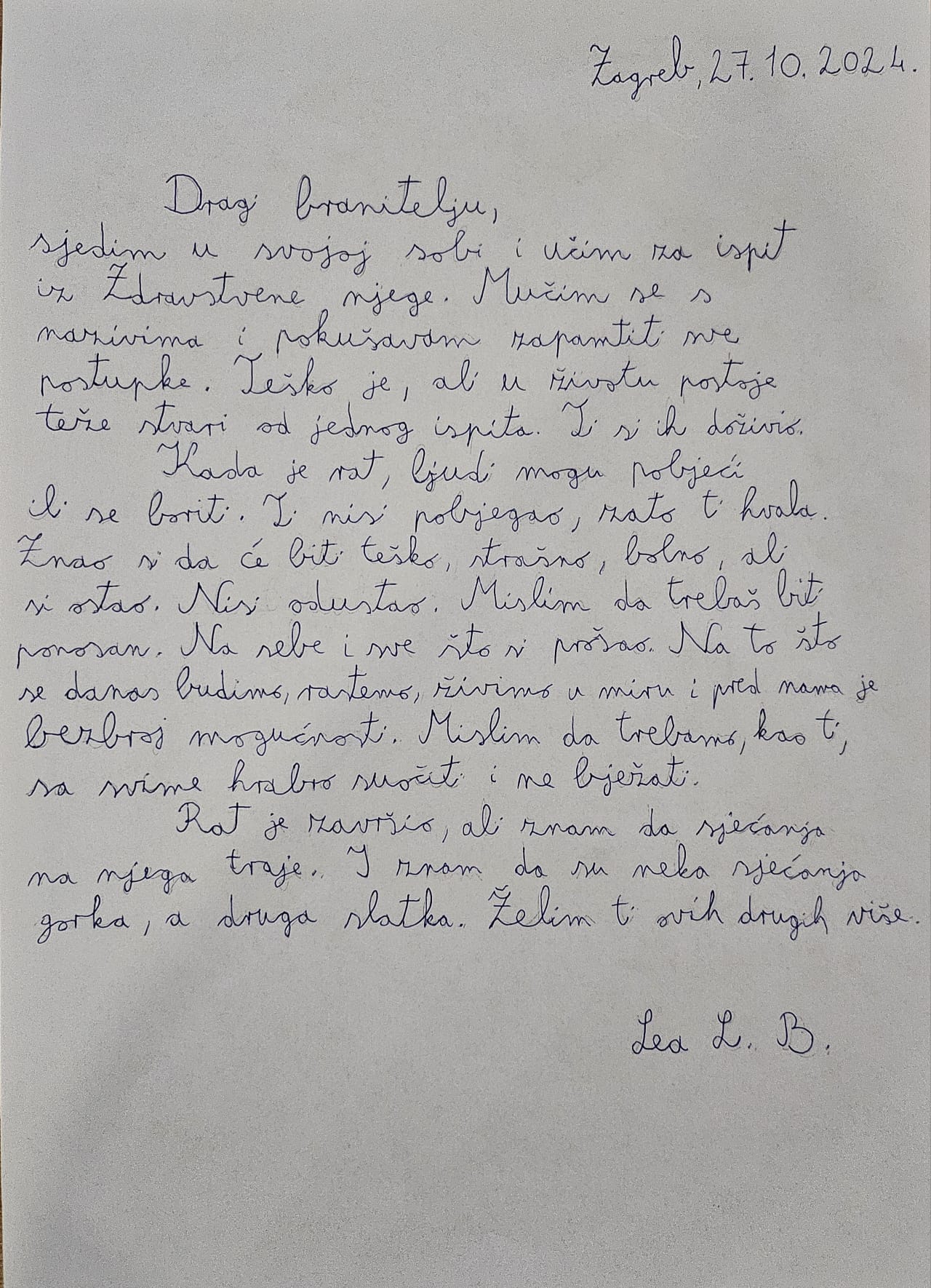 Kada je rat, ljudi mogu pobjeći ili se boriti. Ti nisi pobjegao, zato ti hvala. Znao si da će biti teško, strašno, bolno, ali si ostao. Nisi odustao. Mislim da trebaš biti ponosan. Na sebe i sve to si prošao. Na to što se danas budimo, rastemo, živimo u miru i pred nama je bezbroj mogućnosti. Mislim da se trebamo, kao ti, sa svime hrabro suočiti i ne bježati.