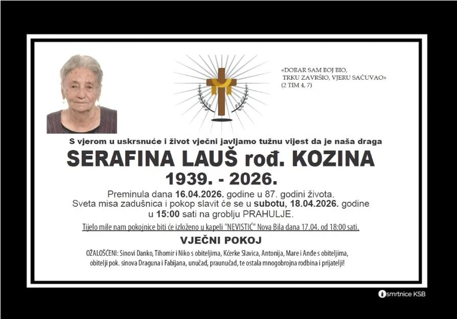 U 87. godini života preminula je Serafina Lauš iz travničkog sela Ćukle, žena čiji je život ostao duboko obilježen osobnom i obiteljskom tragedijom tijekom ratnih događanja u Središnjoj Bosni i žena koja je postala simbolom hrabrih majki iz ratne Bosne i Hercegovine.