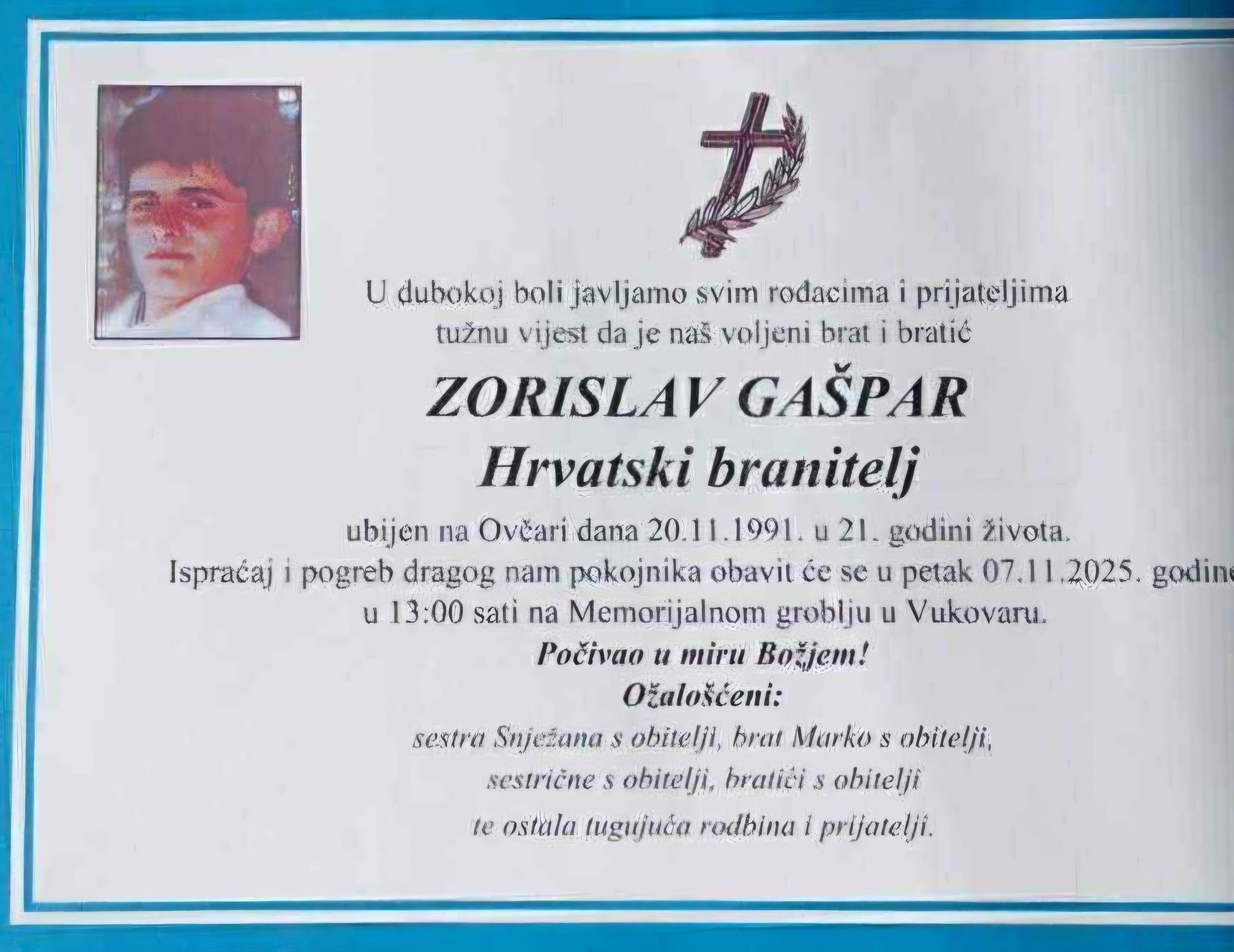 Posljednji ispračaj Hrvatskog branitelja Zorislava Gašpara obavit će se u petak 07.11.2025. godine u 13:00 sati na Memorijalnom groblju u Vukovaru.