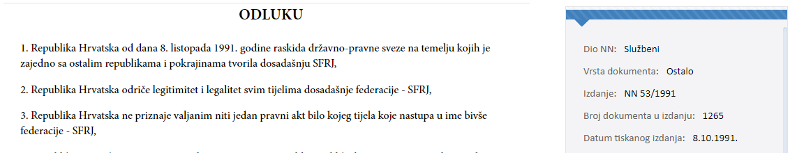 Ustavnom odlukom od 8.listopada 1991.[2] NN 53/1991. članak 3. Republika Hrvatska ne priznaje valjanim niti jedan pravni akt bilo kojeg tijela koje nastupa u ime bivše federacije – SFRJ.