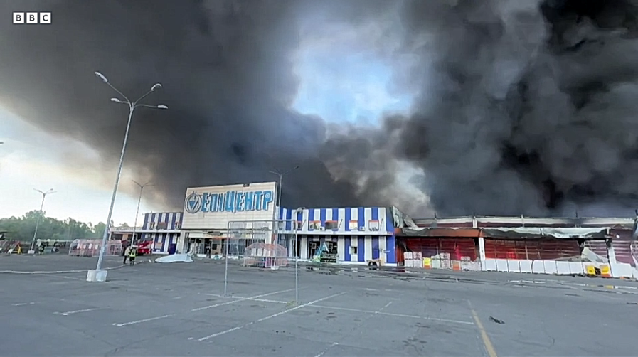Regionalni guverner Oleh Sinehubov izjavio je na nacionalnoj televiziji da su dvije navođene bombe pogodile trgovinu u stambenom području grada, usmrtivši jedanaestoro ljudi. U napadu je ozlijeđeno četrdeset ljudi, a najmanje dvoje poginulih bili su djelatnici trgovine.