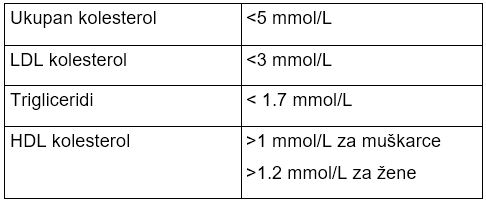 Preporučene vrijednosti masnoća u krvi prikazane su u tablici: