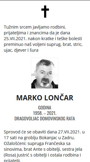 Sprovod će se obaviti dana 27.VII.2021. u 17 sati na groblju Bokanjac u Zadru. Ožalošćeni: supruga Frančeska sa sinovima, brat Ante s obitelji, sestra Jela (Rosa) Justrić s obitelji i ostala rodbina i prijatelji. Počivao u miru Božjem!