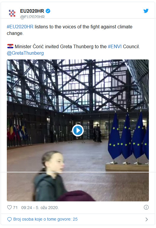 Uoči sastanka Vijeća za okoliš, mlada aktivistica poznata po borbi protiv klimatskih promjena, Greta Thunberg, pozvana je da se obrati ministrima. Ministar Ćorić iskazao je potporu njenom radu