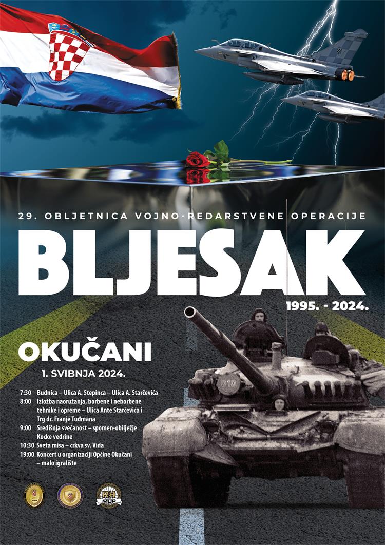 U srijedu, 1. svibnja 2024., u organizaciji Ministarstva obrane, Ministarstva unutarnjih poslova i Ministarstva hrvatskih branitelja, obilježit će se 29. obljetnica vojno-redarstvene operacije Bljesak, uz niz aktivnosti i atraktivan cjelodnevni program.
