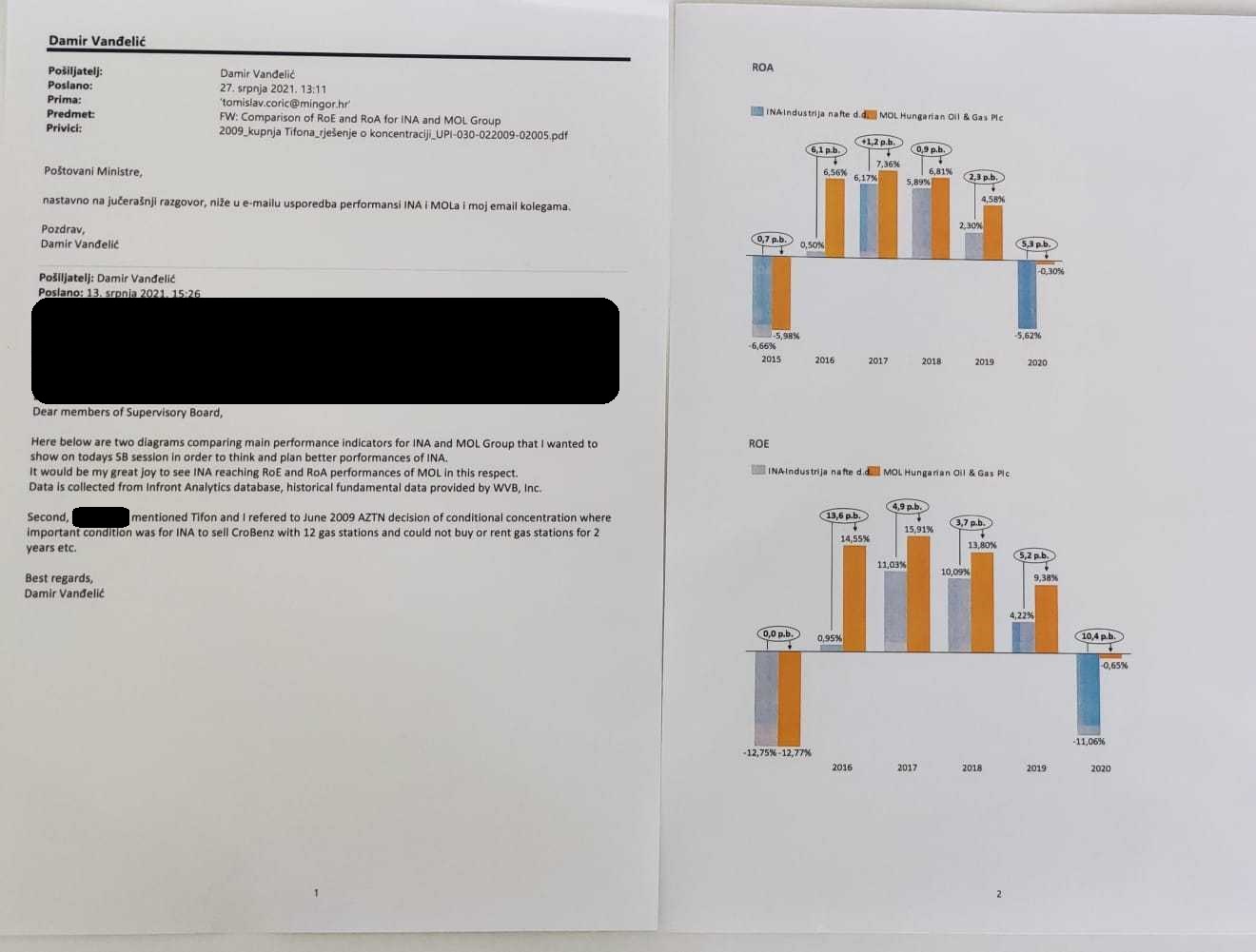 U mailu je priložio grafikone koji kompariraju Inu i MOL po godišnjem povratu na kapital (ROE) – dobit koju je poduzeće ostvarilo u odnosu na kapital koji su vlasnici uložili – te povrat na imovinu (ROA) – odnos neto dobiti/gubitka, koliko se neto dobiti može stvoriti iz jedne jedinice imovine. ROA i ROE su mjerila profitabilnosti neke tvrtke, a uspoređujući od 2015. do 2020., MOL je svake godine bio osjetno profitabilniji od Ine.