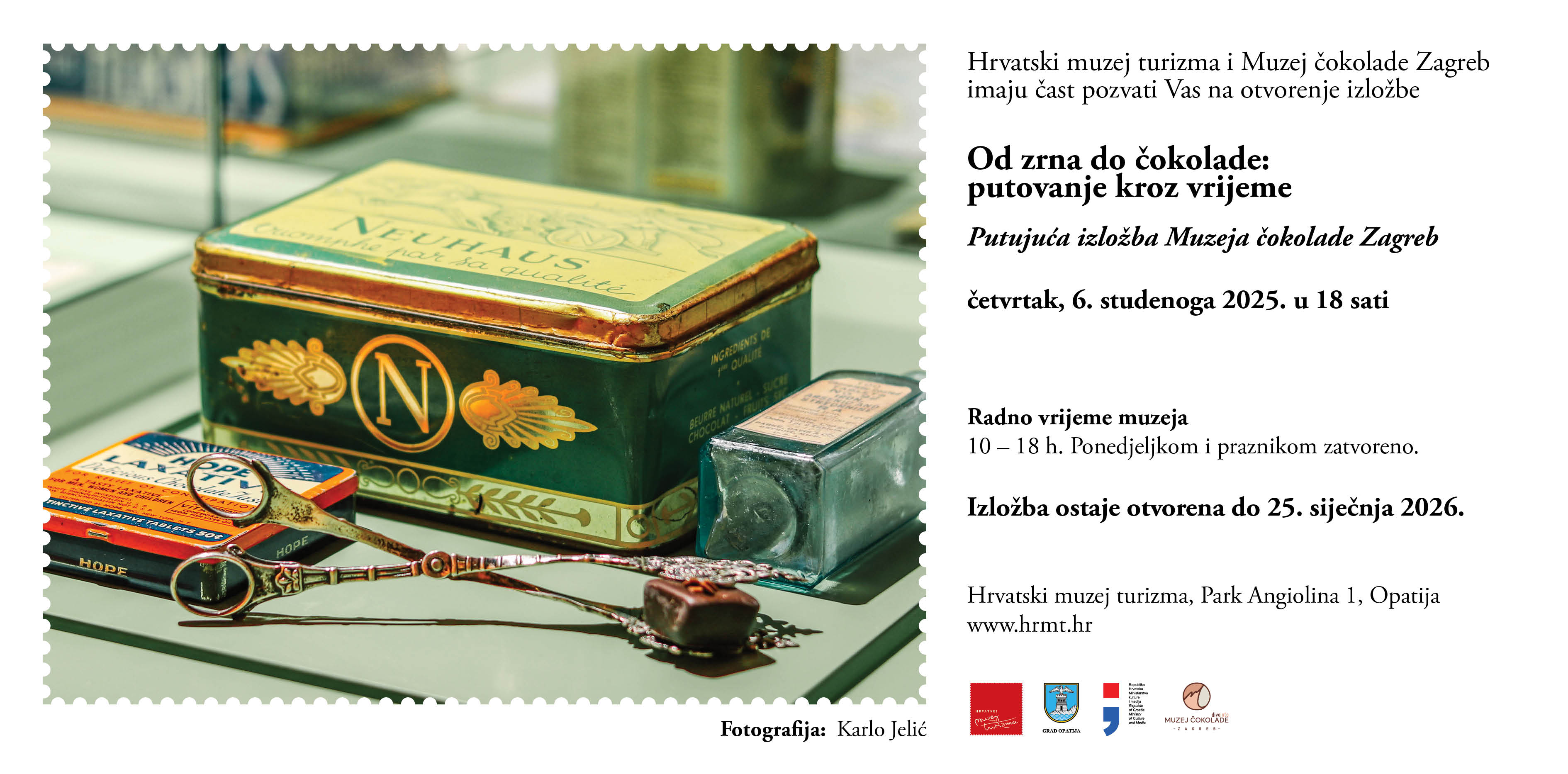 U Hrvatskom muzeju turizma u Opatiji 6. studenoga 2025. u 18 sati otvara se izložba „Od zrna do čokolade: putovanje kroz vrijeme“, koja će posjetiteljima približiti bogatu i ukusnu povijest čokolade – od prvih zrna kakaa do suvremene poslastice kakvu danas poznajemo. Kroz mirise, boje, priče i edukativne sadržaje, izložba će publici omogućiti iskustvo u kojem će povijest moći doslovno osjetiti i vlastitim nepcima.