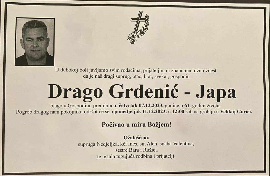 S tugom u srcu i s dubokim poštovanjem opraštamo se od hrabrog branitelja, bivšeg pripadnika 2. gardijske brigade 'GROMOVI', Drage Grdenića - Jape, koji je napustio ovaj svijet 7. prosinca 2023. u 61. godini života. Njegov izuzetan doprinos Domovinskom ratu ostat će urezan u sjećanjima kao primjer hrabrosti i požrtvovnosti.