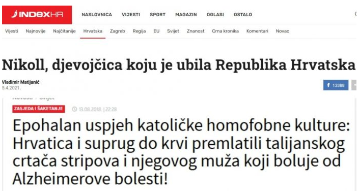 Tako je svojedobno Inoslav Bešker u Slobodnoj Dalmaciji objavio tekst pod naslovom: ”Epohalan uspjeh hrvatske katoličke homofobne kulture: Hrvatica i suprug do krvi premlatili talijanskog crtača stripova i njegovog muža koji boluje od Alzheimerove bolesti!” Naravno, ispostavilo se da Bešker ne govori istinu. Ispostavilo se da djevojka o kojoj je riječ, izvjesna Yasmina Ramić, nije Hrvatica niti je katolkinja te da čak ne zna hrvatski jezik. Navodno je njezina majka u Belgiju došla iz Zagreba prije 29 godina, i to bi bila jedina veza između počiniteljice i Hrvatske. Pravi počinitelj, djevojčin dečko, s Hrvatskom ima još manje veze, riječ je bugarskom državljaninu, a je li Bugarin, bugarski Turčin ili nešto treće, neka utvrđuje koga to zanima. Ovaj slučaj iz 2018. paradigmatski je primjer manipulacije o kojoj u ovom tekstu govorim, stoga na njega treba podsjetiti s vremena na vrijeme jer Hrvati brzo zaboravljaju.