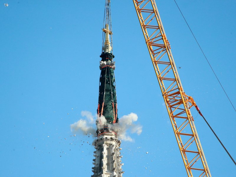 Dio sjevernoga tornja katedrale skinut je u 17,58 minuta kontroliranom eksplozijom do koje je došlo po pritisku na gumb detonatora.