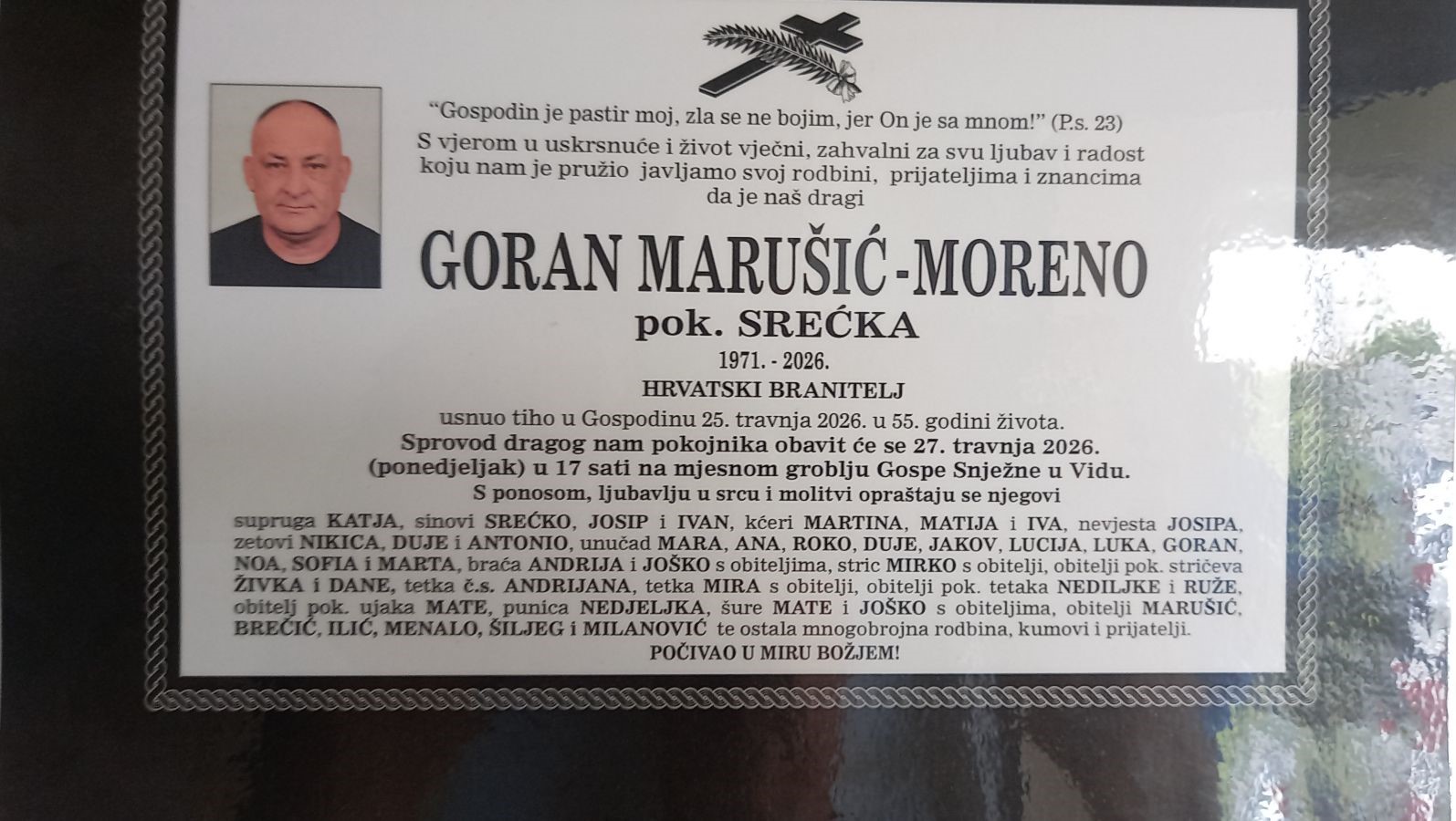 U 55. godini života preminuo je hrvatski branitelj, dočasnik Hrvatske vojske i dragovoljac Domovinskog rata Goran Marušić – Moreno, koji je svojim predanim radom i nesebičnim zalaganjem ostavio dubok trag u zajednici i obrani Domovine.
