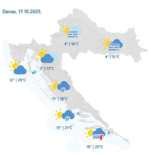 Petak će donijeti promjenjivo vrijeme diljem Hrvatske, uz izmjenu oblaka i sunčanih razdoblja. U unutrašnjosti će mnoge jutarnje sate obilježiti lokalna magla, ponegdje i dugotrajnija, osobito u nizinama i kotlinama. Temperature će u kontinentalnim krajevima biti razmjerno svježe, između 13 i 17 °C, dok se u Zagrebu očekuje najviša dnevna temperatura oko 16 °C.