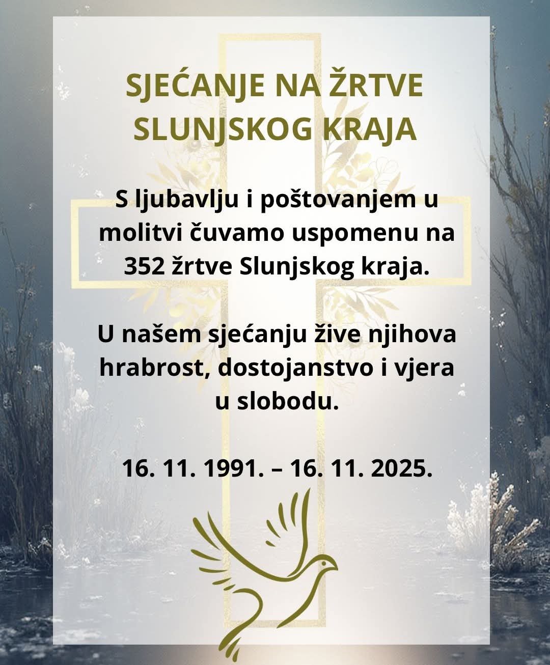 Grad Slunj, koji danas broji nešto više od 5.000 stanovnika, 16. studenoga svake godine prisjeća se najtragičnijeg dana svoje novije povijesti – dana kada je 1991. godine započelo masovno progonstvo stanovništva. Tisuće obitelji napustile su svoje domove noseći samo ono najnužnije, dok je na okupiranom području ostalo tek nekoliko stotina ljudi, izloženi svakodnevnim prijetnjama, mučenjima i nasilju.