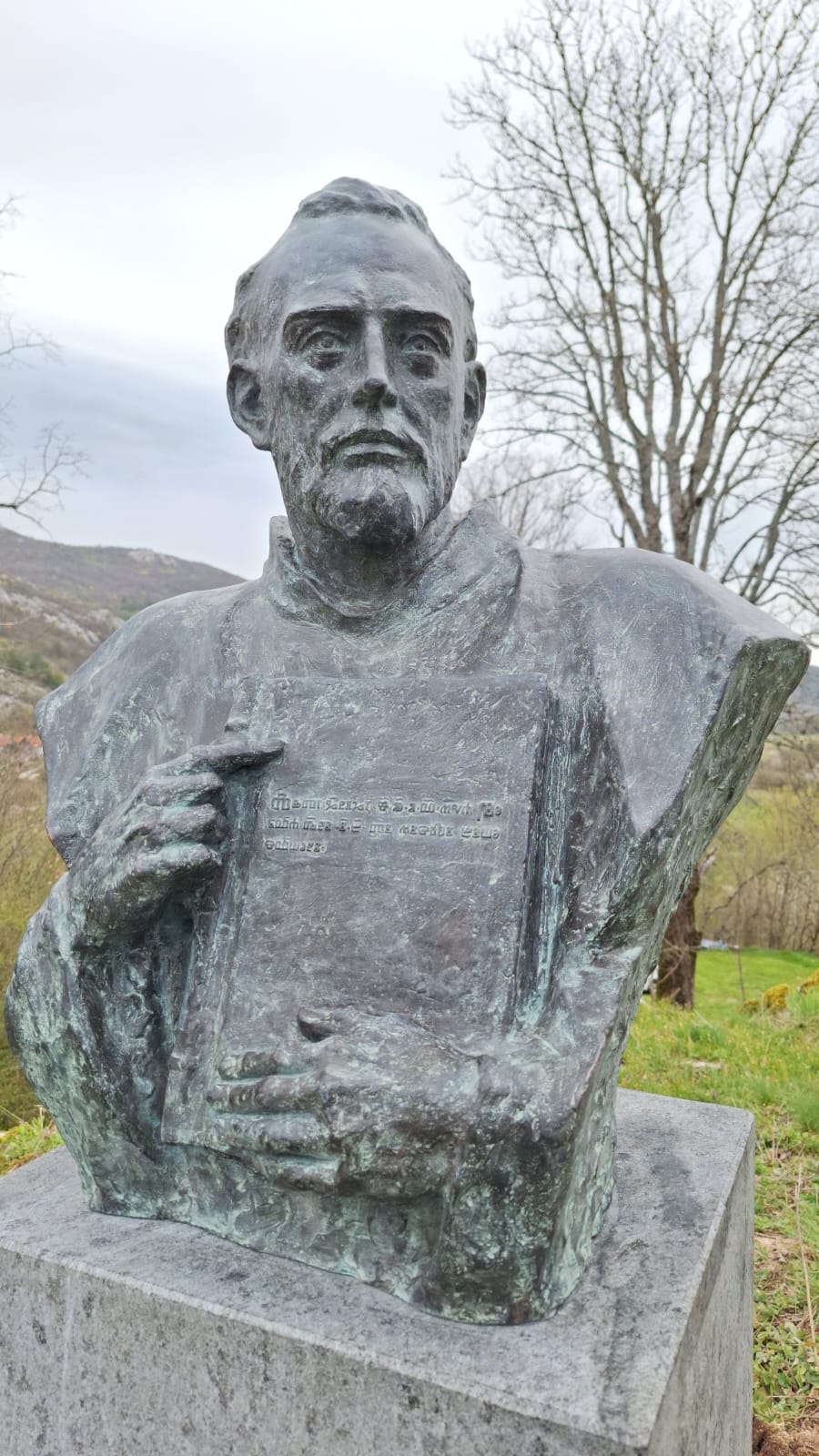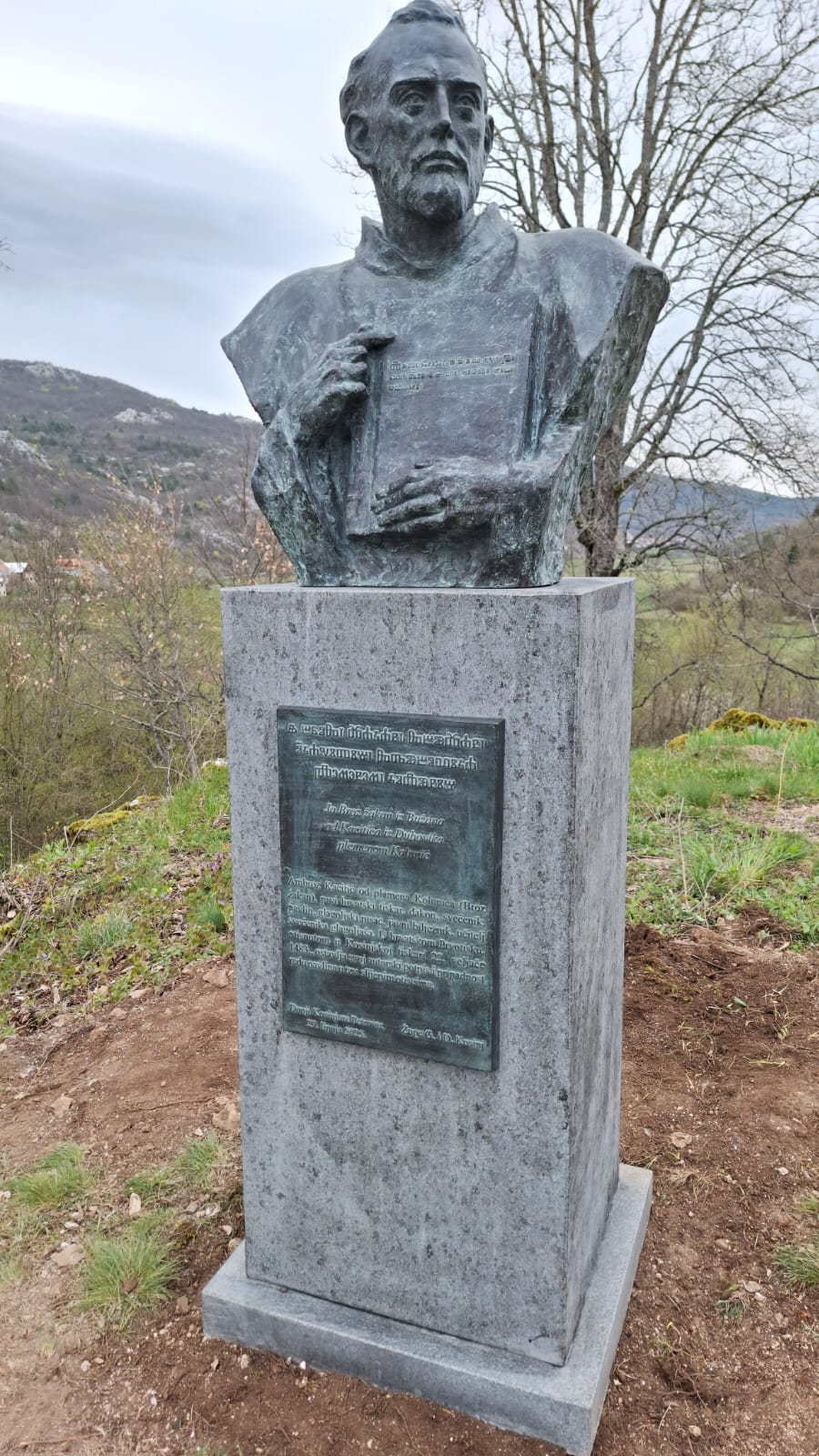 Autor spomenika i ploča je akademski kipar Slaven Miličević, a posebno značenje ima detalj u kojem Kacitić drži u rukama knjigu – hrvatski Prvotisak, Misal po zakonu rimskoga dvora, tiskan 22. veljače 1483. Na knjizi je glagoljicom ispisan originalni kolofon: