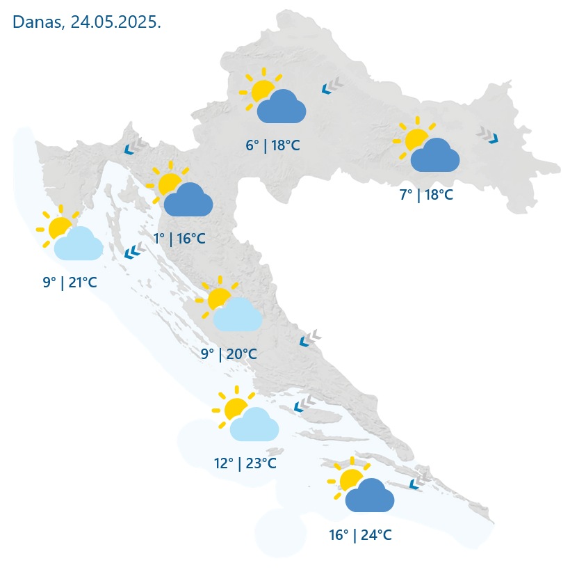 U većem dijelu zemlje danas prevladava djelomice, a na Jadranu i pretežno sunčano vrijeme. Jutarnje temperature na kopnu razmjerno su svježe, uz mogućnost pojave lokalne magle, osobito u nizinama.