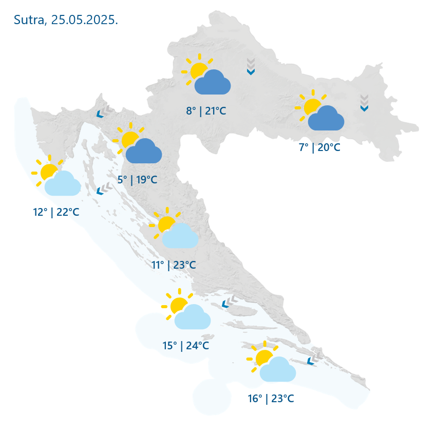 Jutarnje temperature bit će od 5 do 10 °C na kopnu, te između 11 i 16 °C na Jadranu. Najviša dnevna temperatura većinom će se kretati između 19 i 24 °C.