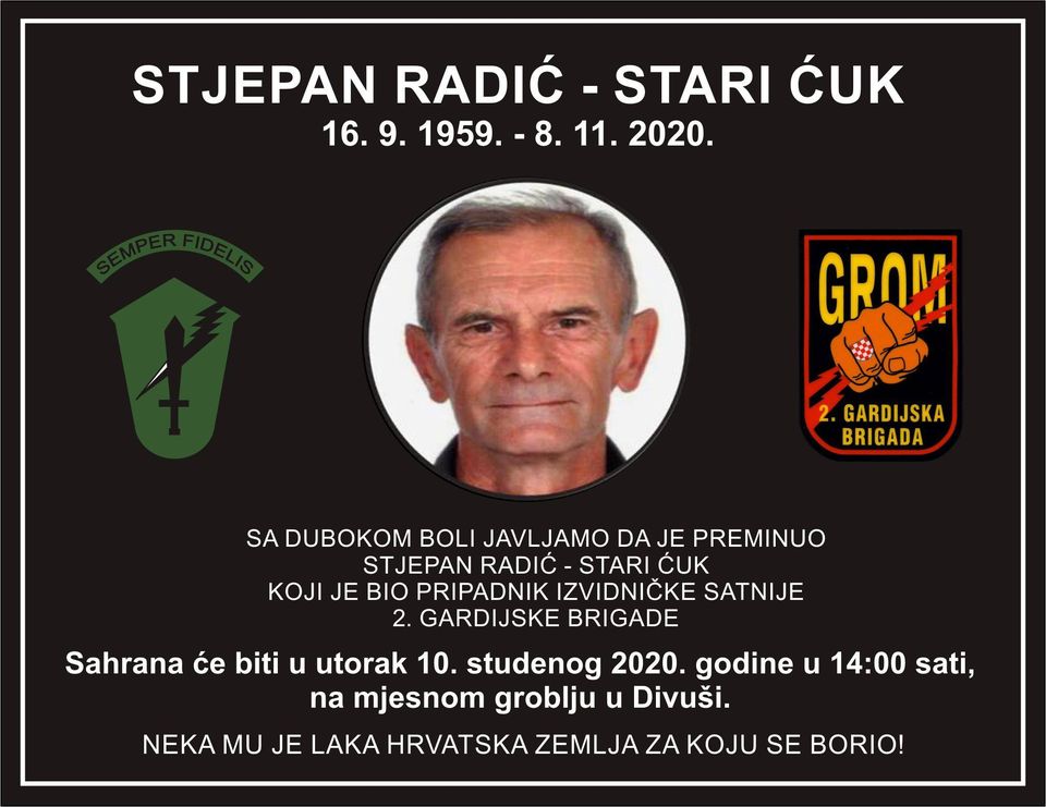 S tugom i žalosti obavješćujemo sve ratne veterane 2. gardijske brigade “Gromovi”, hrvatske branitelje, prijatelje i poznanike da je umro naš Grom, pripadnik Udruga ratnih veterana 2. gardijske brigade Gromovi hrvatski branitelj, Stjepan Radić – Stari Ćuk