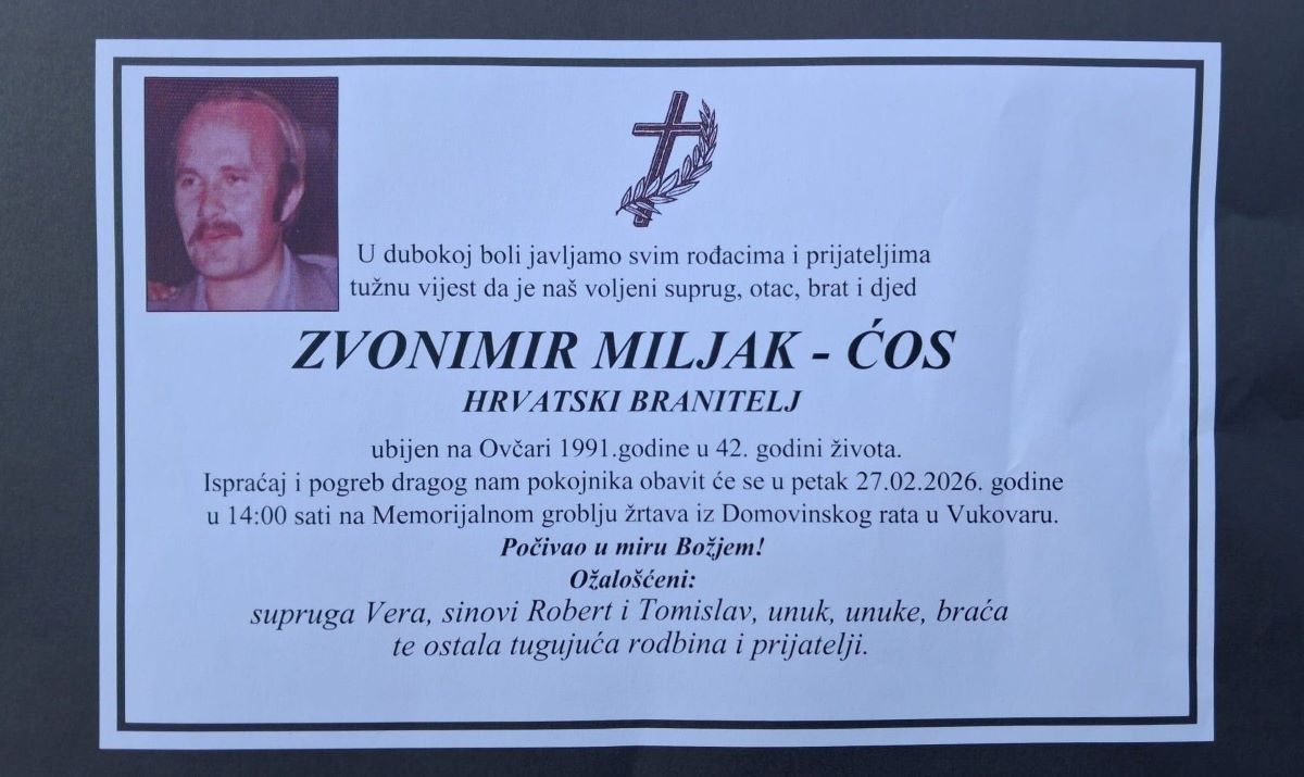 Dok se hrvatski javni prostor guši u ideološkim obračunima i dok traje neumorni "lov na ustaše" koji služi kao paravan za dnevnopolitičke interese, u tišini Vukovara jedna obitelj napokon zatvara krug pakla. U petak 27. veljače 2025. godine, na Memorijalnom groblju žrtava iz Domovinskog rata u Vukovaru, bit će pokopani posmrtni ostaci Zvonimira Miljka. Identificiran tek deset dana ranije, on se nakon pune 34 godine vraća svojoj obitelji i zemlji za koju je dao život.