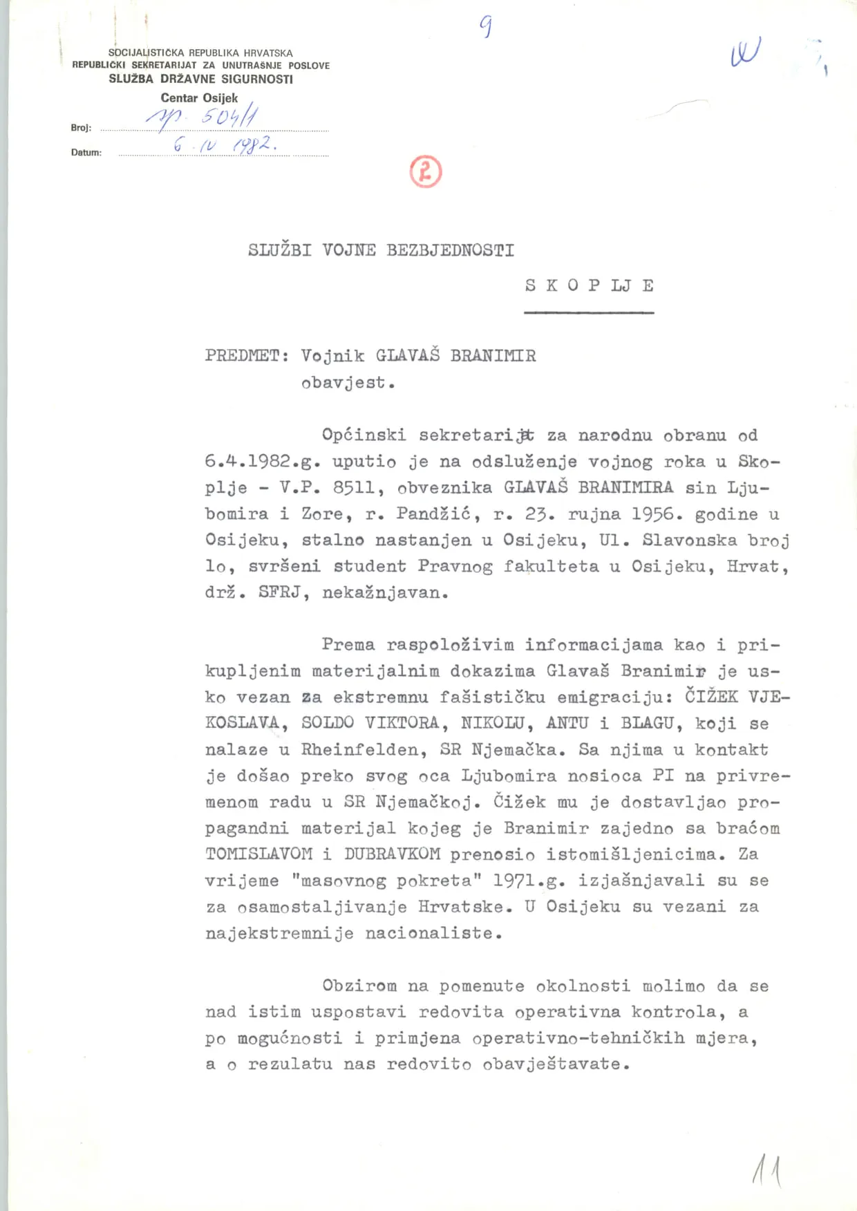 “Nekome je Općinski komitet SKJ-u (svojima) pisao preporuke prilikom odlaska u JNA na služenje vojnog roka u SFR Jugoslaviji, a meni je ‘preporuku’ pisala UDBA. U JNA sam otišao 6. travnja 1982., a istog dana je za mnom osječka UDBA pisala KOS-u o meni svoj stav, kako bi KOS znao kakav ‘problematičan’ tip im dolazi služiti JNA i da me drže na oku”, piše Glavaš i objašnjava: