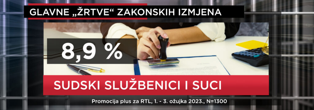Da će nastradati suci i sudski službenici smatra 8,9 posto, a da je glavna žrtva sama javnost smatra 8,4 posto sudionika istraživanja. Slijede odvjetnici osumnjičenih ili optuženih (6,2 posto), a onda i državni odvjetnici (4,4 posto), policija je najniže na ljestvici mogućih žrtava izmjena zakona i to misli 3,3 posto ispitanika.