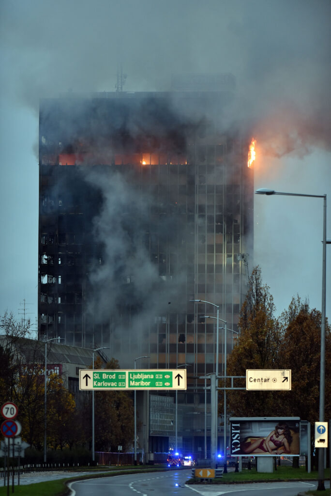Nešto prije ponoći u ponedjeljak izbio je požar u neboderu Vjesnika na Slavonskoj aveniji u Zagrebu. Vatra se brzo širila vertikalno, zahvaćajući više katova i krovište, pa je u gašenje uključeno velik broj vatrogasaca i vozila. Zgradi se zbog opasnosti ne može prići bliže od pedesetak metara. Iako se povremeno čini da plamen jenjava, svakih nekoliko minuta ponovno bukne nekoliko katova ispod velike reklame za Večernji list.