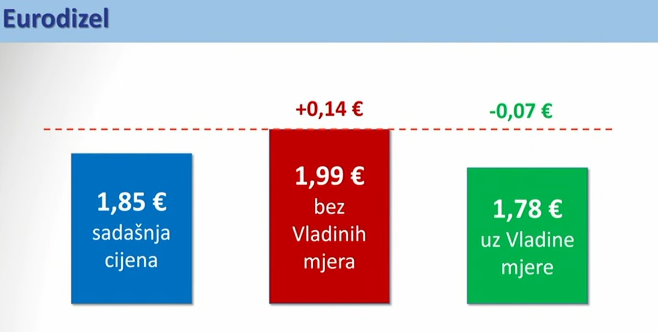 “Od početka krize sukoba na Bliskom istoku, još jednom donosimo akte kojima ograničavamo cijene naftnih derivata, prema današnjim izračunima od sutra bi cijena eurosupera trebala biti 1,64, cijena dizela za 7 centi niža na 1,78, cijena plavog dizela na 1,29, cijena ukapljenog naftnog pina na 1,76 i ukapljenog naftnog plina za boce na 2,34”, rekao je premijer.