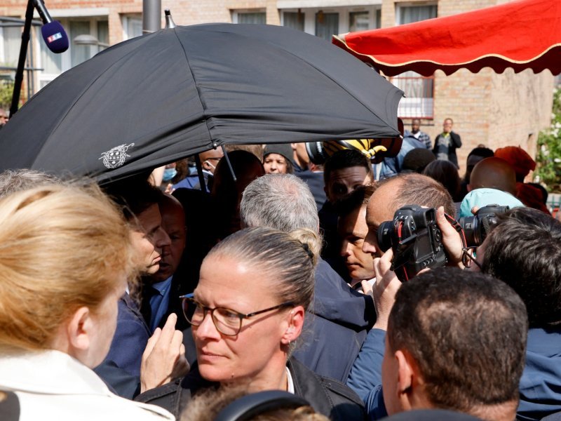 Rajčice nisu pogodile predsjednika Macrona, no njegovo je osiguranje burno reagiralo. Uz povike 'projektil', odmah su otvorili kišobran kako bi zaštitili Macrona od rajčica, a nakon toga odmah su ga izvukli iz gomile i odveli na sigurno.