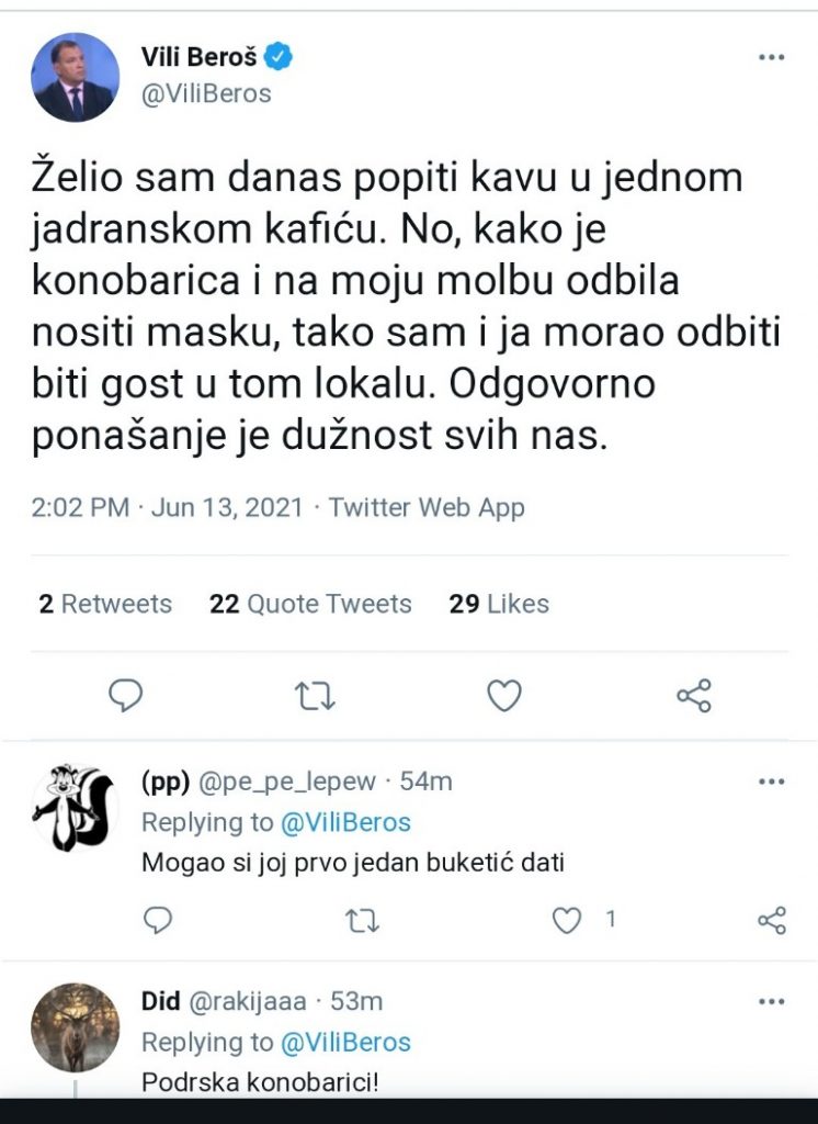 Nakon što je ministar zdravstva Vili Beroš alarmirao nadležne i prijavio kako je došao u kafić na Narodnom trgu u Zadru gdje mu je kavu poslužila konobarica bez maske, nakon čega je demonstrativno otišao, gosti kafića ispričali su kako je ministar ostao dužan, odnosno da nije u potpunosti podmirio račun.